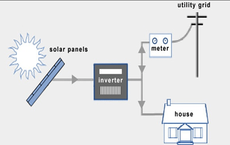 One of the major differences between the gird connected and the stand-alone PV system is storage battery. There is no need of battery requirement for the grid connected PV system because the power obtained from the grid can be directly stored in the array. It can also be considered as one of the disadvantage because the isolation is very weak at the night time so that the PV array can lose their output power capability during that situation. It can be overcome by using the multi functioning inverter. The block diagram for the Grid connected PV system is shown below.