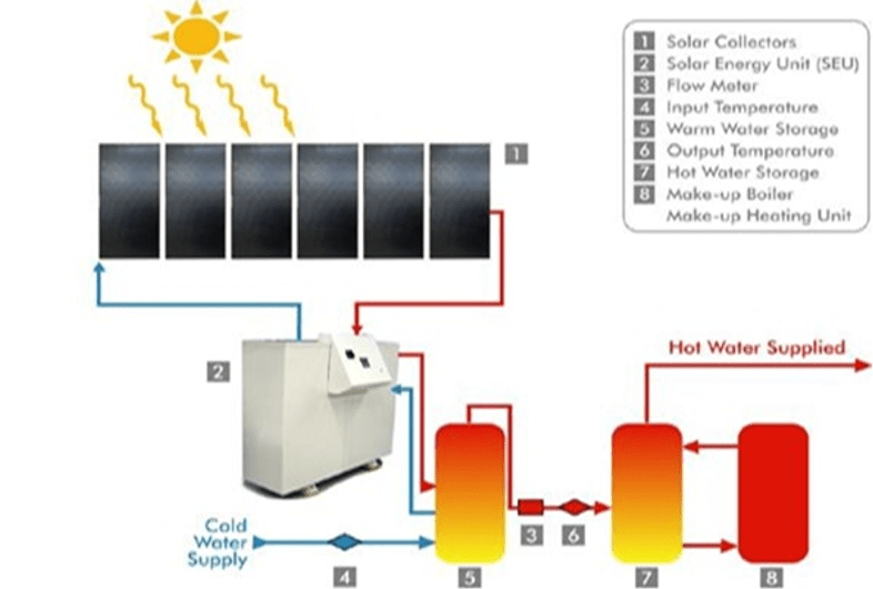 A solar water heater consists of a collector to collect solar energy and an insulated storage tank to store hot water. The solar energy incident on the absorber panel coated with selected coating transfers the hat to the riser pipes underneath the absorber panel. The water passing through the risers get heated up and are delivered the storage tank. The re- circulation of the same water through absorber panel in the collector raises the temperature to 80 C (Maximum) in a good sunny day. The total system with solar collector, storage tank and pipelines is called solar hot water system.