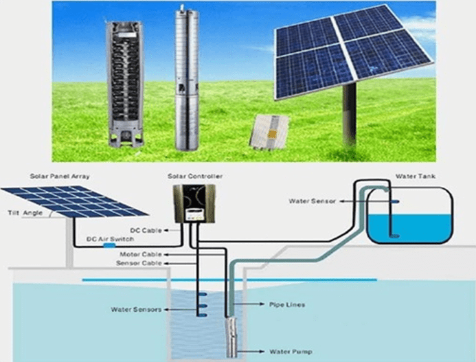 A solar photovoltaic (SPV) water pumping system consists of a PV array, a DC/AC surface mounted/ submersible/ floating motor pump set, electronics, if any, interconnect cables and an “On-Off” switch. PV Array is mounted on a suitable structure with a provision of tracking. Electronics could include Maximum Power Point Tracker (MPPT), Inverter and Controls/Protections. Storage batteries will not constitute a part of the SPV Water Pumping System.
